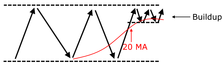 Then you want to let the 20-period moving average, touch the lows of the buildup. This signals to you that the market is now getting ready to breakout.