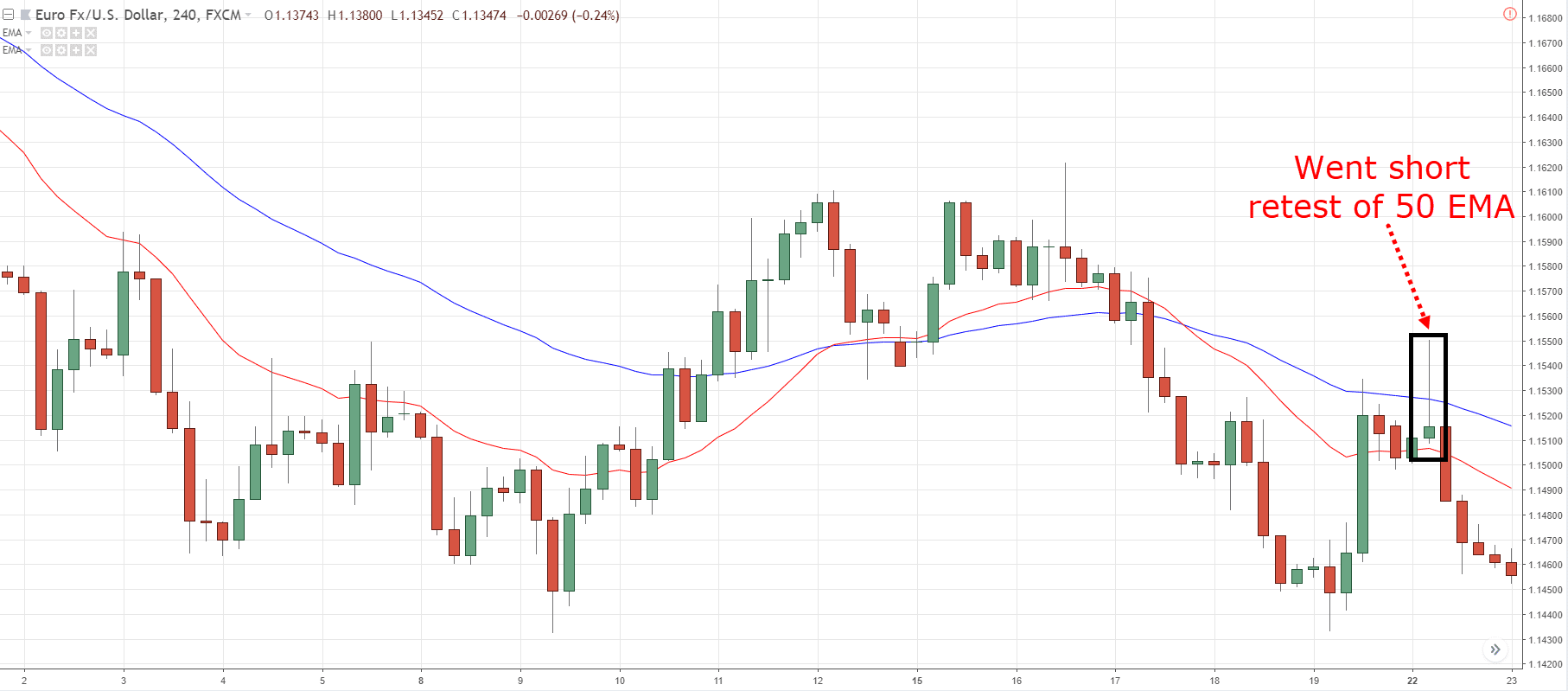 You’re currently short EUR/USD on this 4-hour chart when price retested the 20 EMA and, your stops are above the 50 EMA.