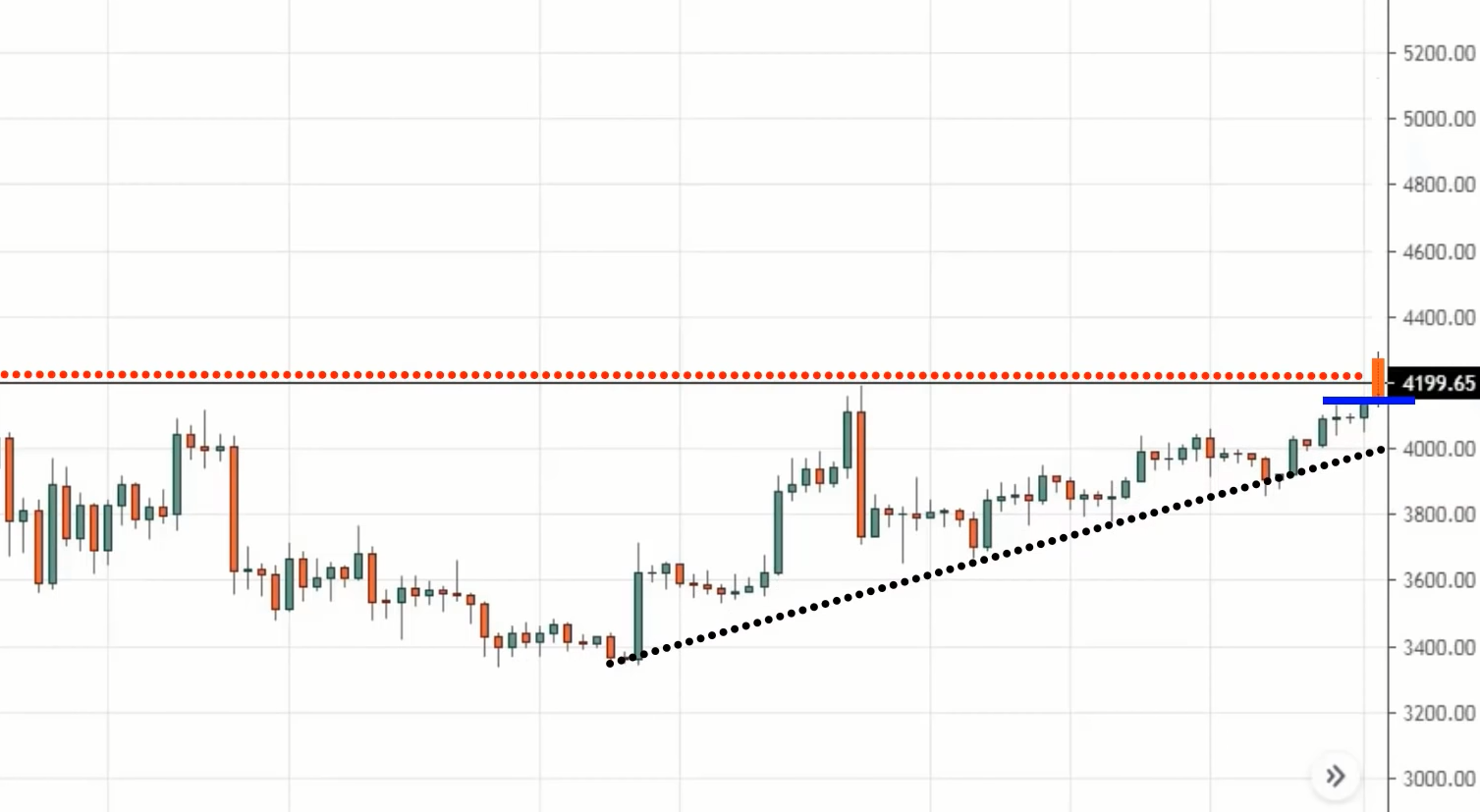 Let's go back to the earlier example of Bitcoin, where you see a series of higher lows into resistance. Now let’s imagine that there’s a bearish candle at the right side.