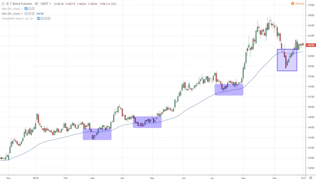 The market is in an uptrend and if you pull out the 50-period moving average, you’ll notice that the price tends to respect the moving average.