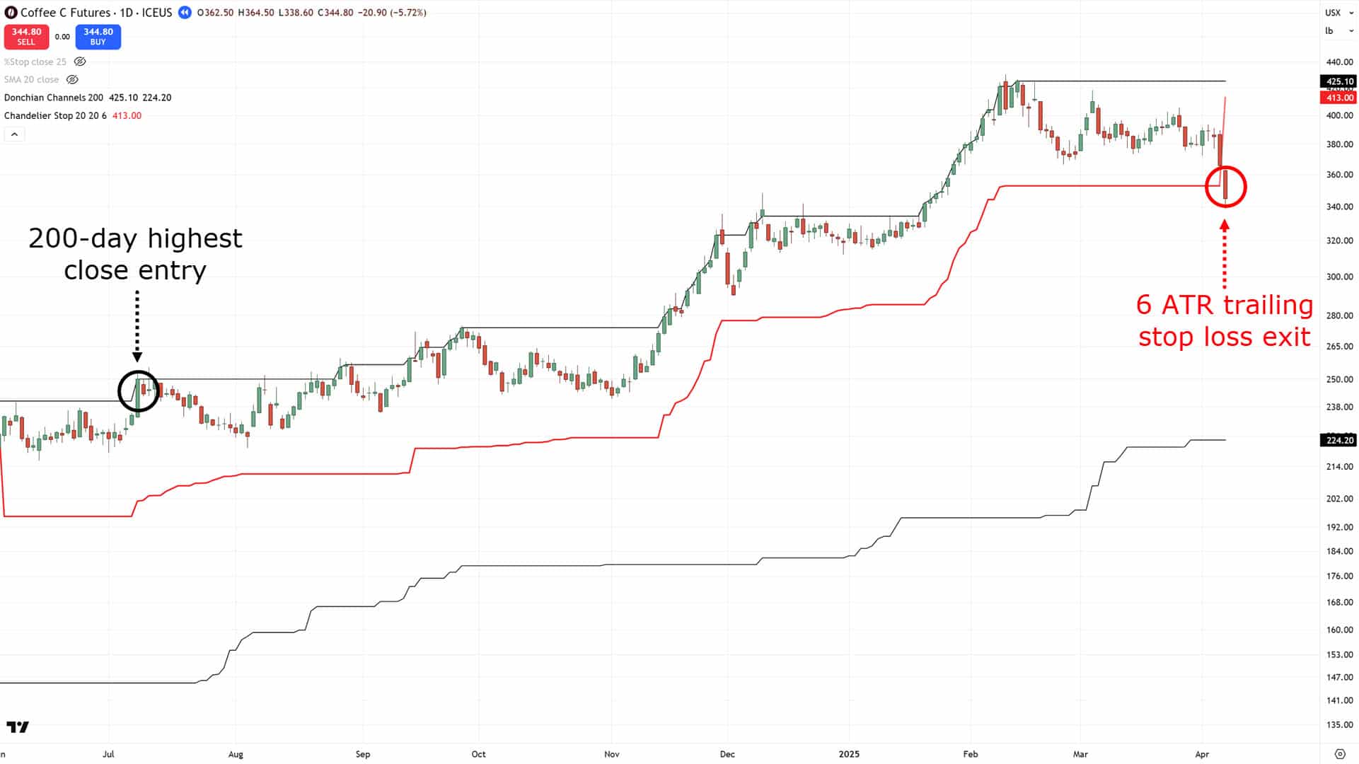 On July 9, 2024, Coffee made the highest close over the last 200 days (as shown on the Donchian Channel) and gave you an entry trigger to go long.