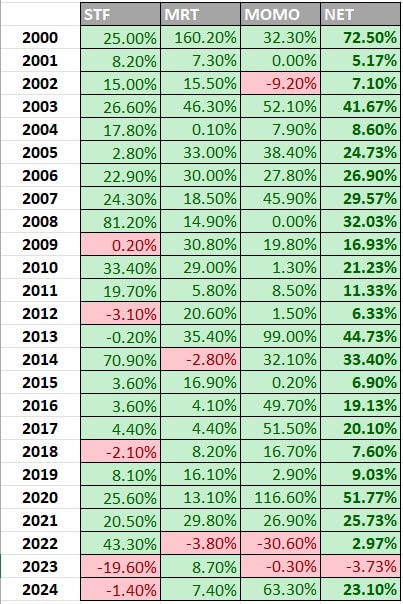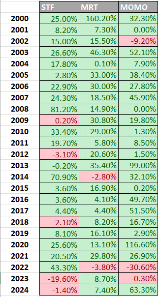Systematic trend following (STF) had losing years in 2009, 2012, 2018, 2023, and 2024.